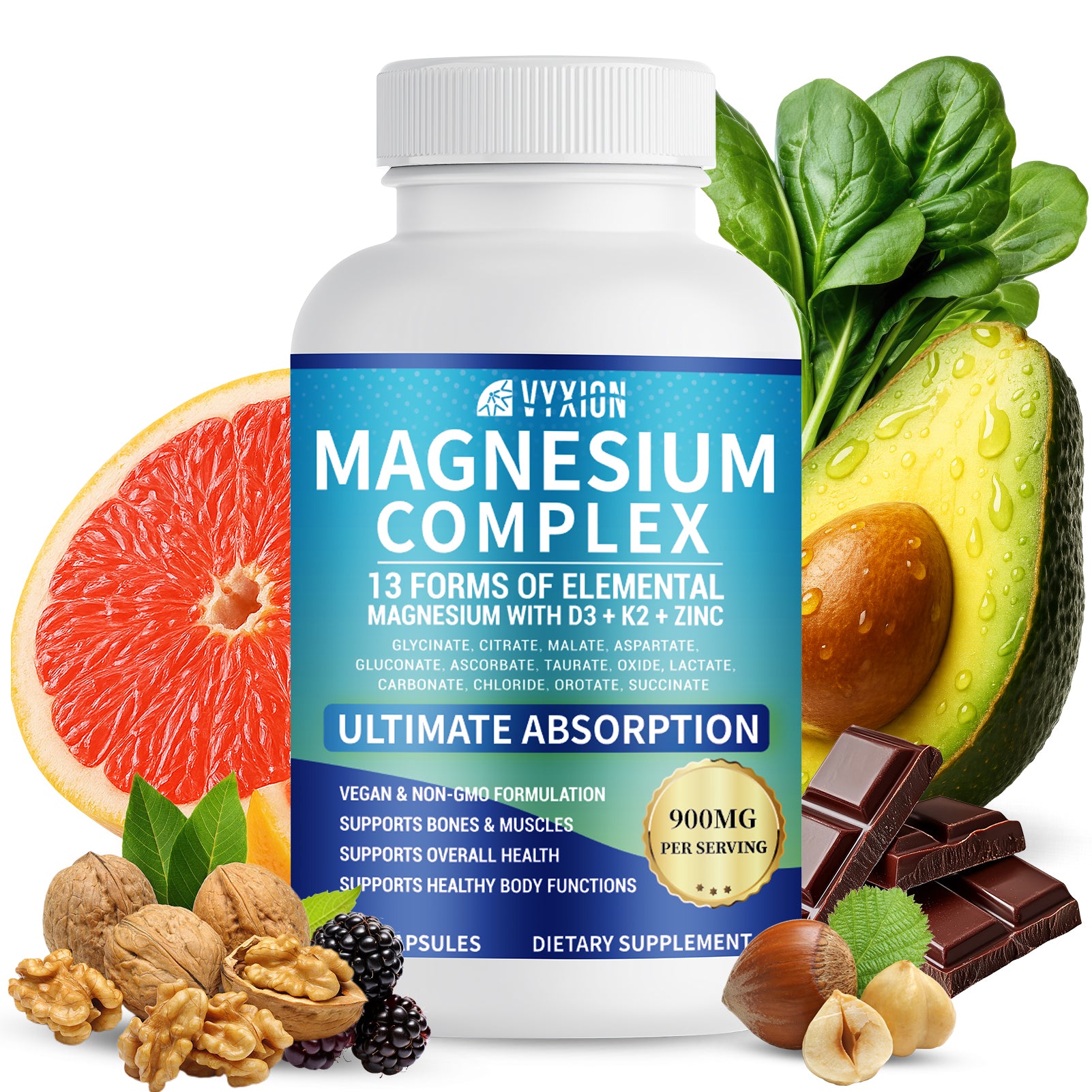 Magnesium Complex 900mg per Serving – High Absorption Magnesium Glycinate with Vitamin D3 K2 Zinc & B Vitamins – Sleep, Calm, Muscle & Nerve Support – 90 Capsules