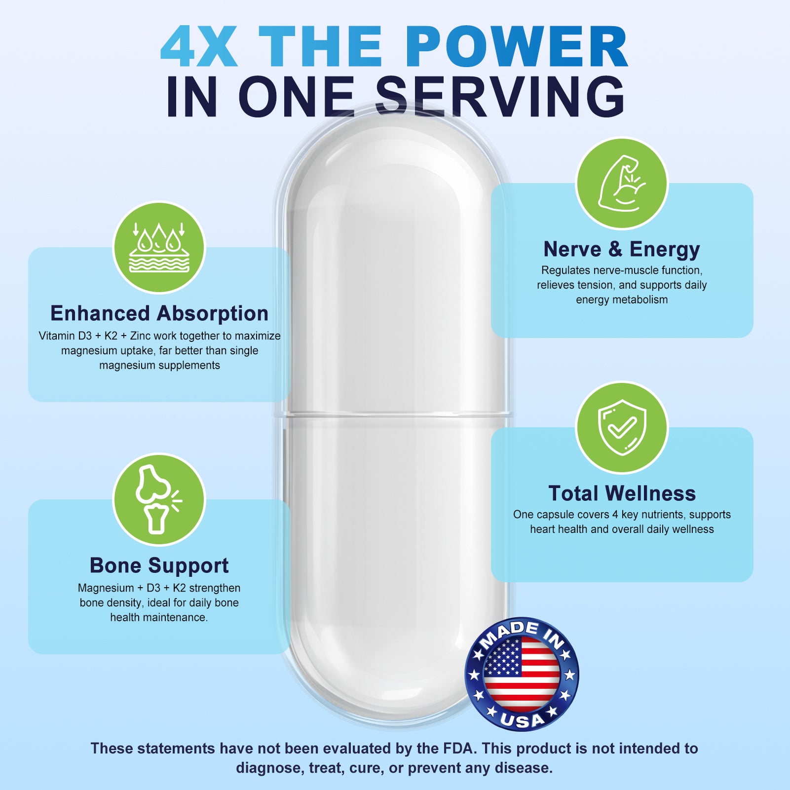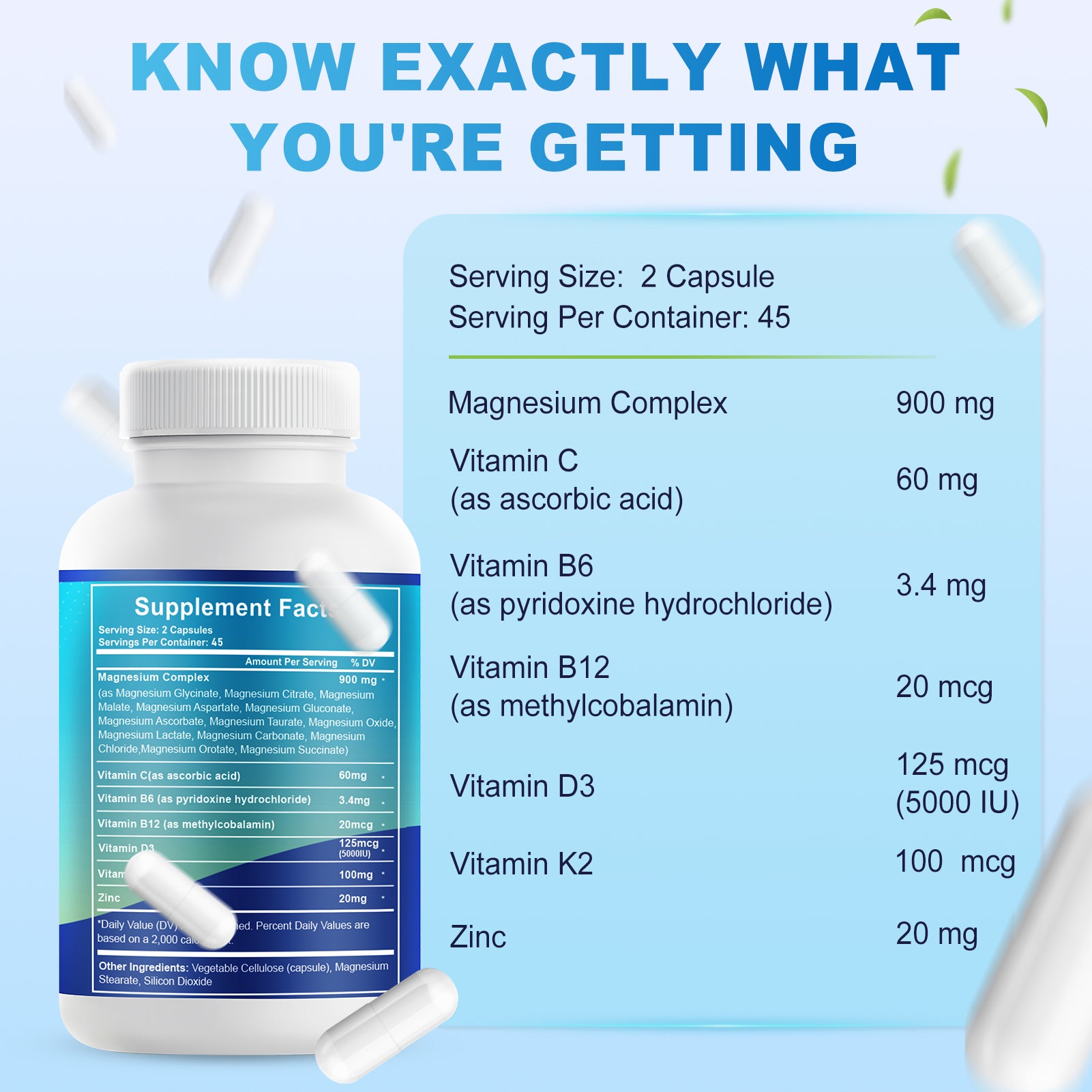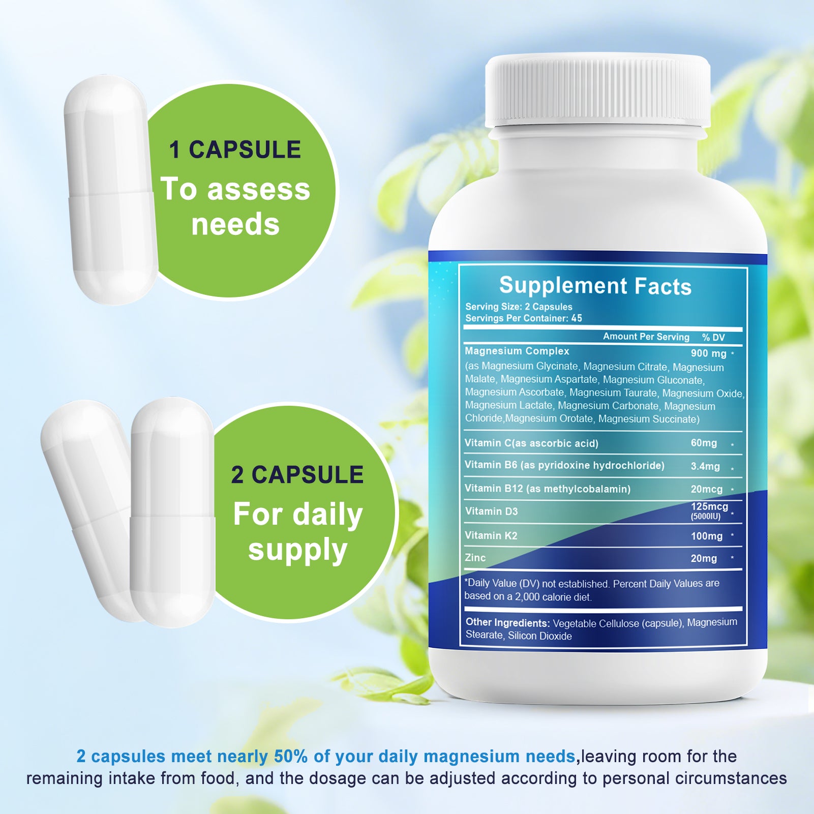- High Absorption Magnesium Complex with Key Cofactors:Formulated with Vitamin D3, Vitamin K2, Zinc, and B Vitamins to support magnesium utilization and overall nutrient balance for daily supplementation